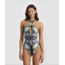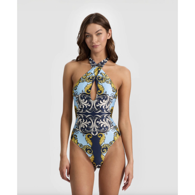 ALICE + OLIVIA x PQ Swim fuses playful prints, feminine silhouettes, and the spirit of endless summer. A celebration of confidence and color, this collection was designed for sun-drenched days and unforgettable escapes. The Cross Front One Piece is your new power swimsuit with a halter-neck silhouette and a peek-a-boo slit in the front, tied together with an oversized bow in the back.