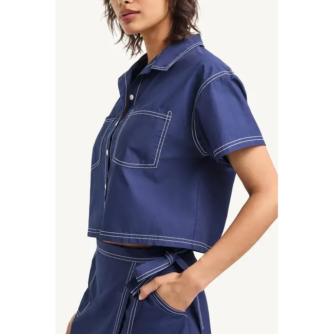 A crisp update to a classic, the Ashley Cropped Shirt in Midnight Indigo is crafted from breathable cotton poplin and finished with thoughtful details. It features a button-front closure with natural corozo buttons, front patch pockets, and contrast stitch detailing for a modern edge.