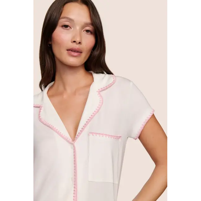 We took all the best features of our best-selling Gisele collection—the softness, the comfort, the temperature-regulating fabric—and added eye-catching artisanal whipstitch piping to both the top and bottom for a playful, Bohemian vibe. Made from TENCEL™ Modal fibers and a touch of spandex, this super soft fabric is verified by OEKO-TEX® Standard 100, meaning it’s dyed with safe and non-toxic dyes. This set has a classic slim fit short sleeve top and a low-rise cheeky short with an elastic waistband, so you can feel comfortable and stylish all at the same time. Pair Pima intimates underneath for breezy ZZZ’s.