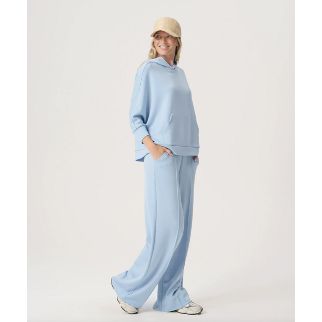 Polished, packable, and impossibly soft. The Jet Set Pant in Blueberry is crafted from luxe scuba knit for a flattering drape and all-day comfort. The wide-leg silhouette feels elevated yet easy, while front pockets and subtle pintuck seams add just the right amount of structure. Finished in a soft, sky-toned blue that pairs perfectly with the matching Travel Hoodie or your go-to tank. Whether you're airport-bound or strolling seaside, these pants move with you.